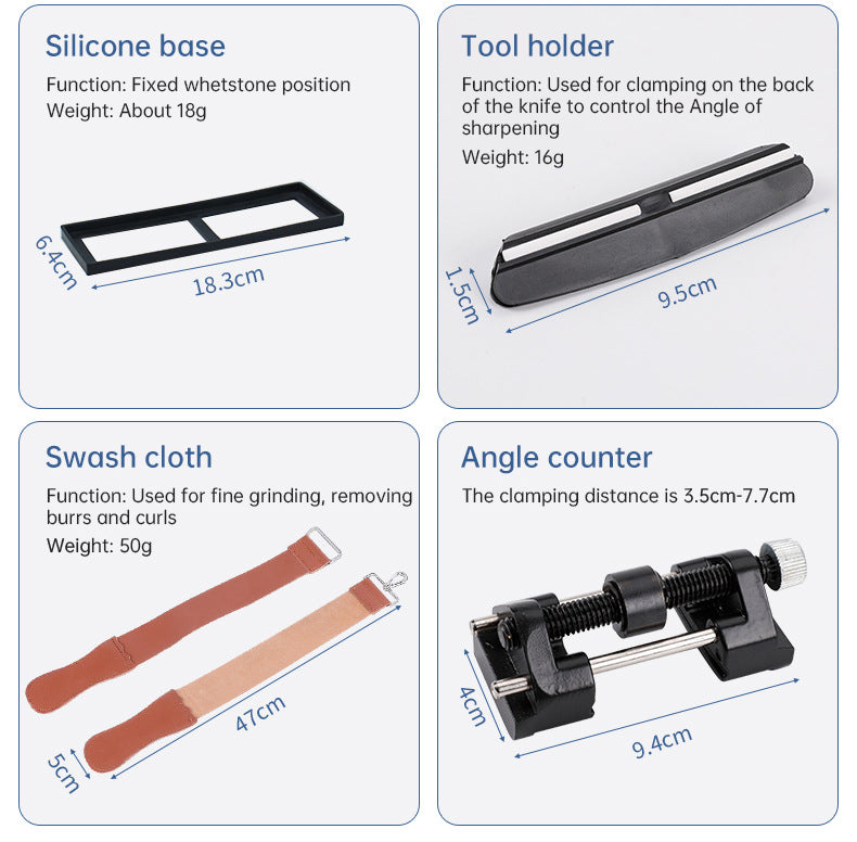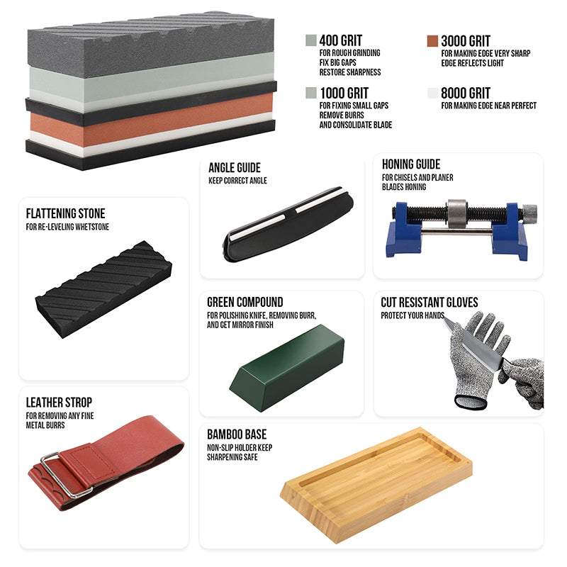 【Superior Complete Bundle】Your complete knife sharpening set comes with two Double Sided Japanese Grit Whetstone 400/1000 & 3000/8000 with Non-Slip bamboo base for holding the waterstone securely; angle guide holds the knife on the correct angle; leather strops & green polishing compound to polish knife and removing burr, black flattening stone used for leveling whetstones, cut resistant gloves for protecting your hands, honing guide for chisels, a user manual for learning sharpening skills