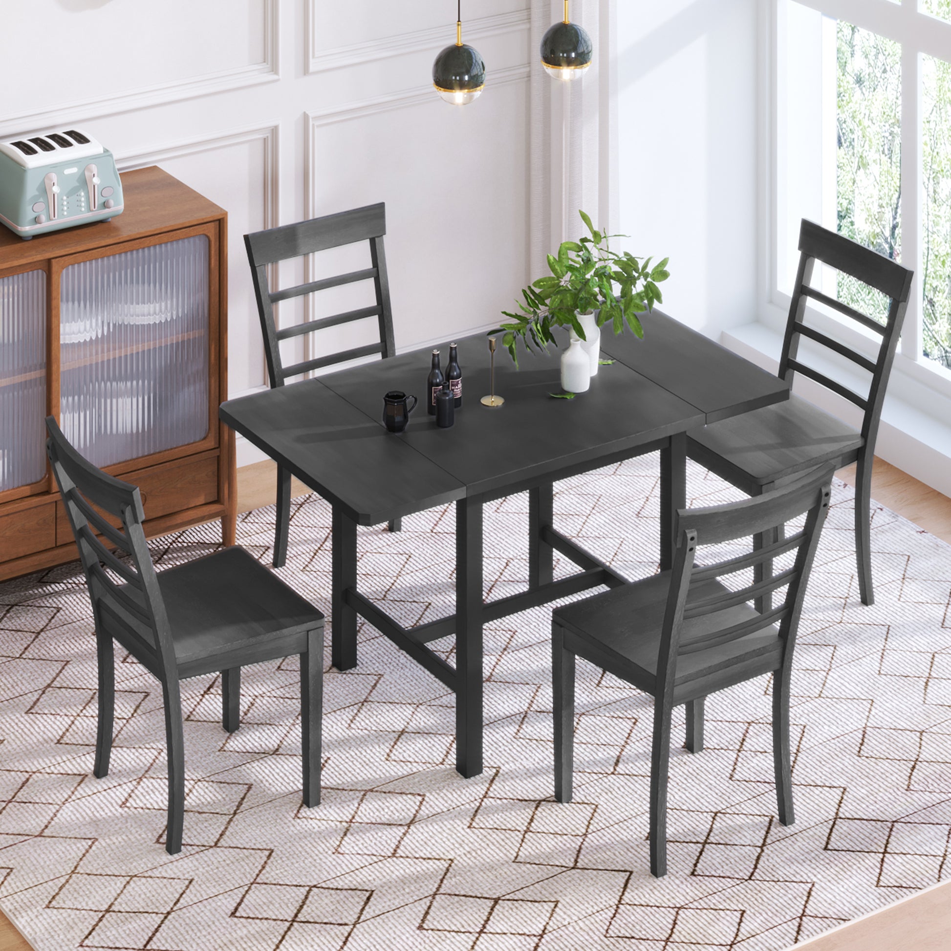 Get a stylish dining set with four chic chairs and an adaptable kitchen table. This set adds versatility to your dining space with its extendable drop-leaf design, offering the option to create more room for living or dining. With leaf, the table will be easily expanded from 29.5 inch to 53.1 inch.